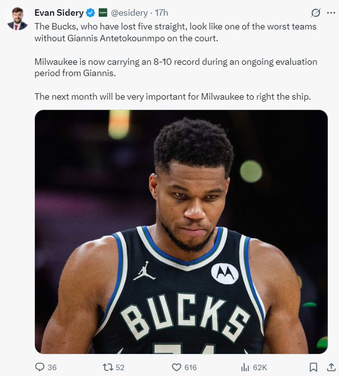 雄鹿季后赛概率仅剩46% 字母缺席1胜4负 湖记开始畅想未来加盟LAL