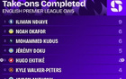 英超第5轮过人榜:恩迪亚耶9次最多,奥卡福、库杜斯各6次第二